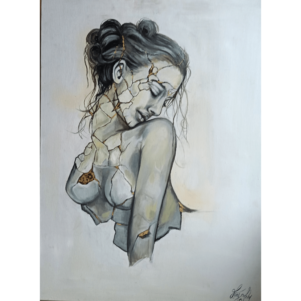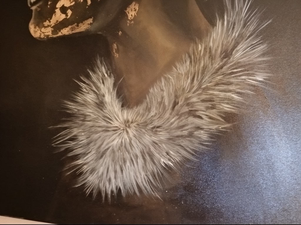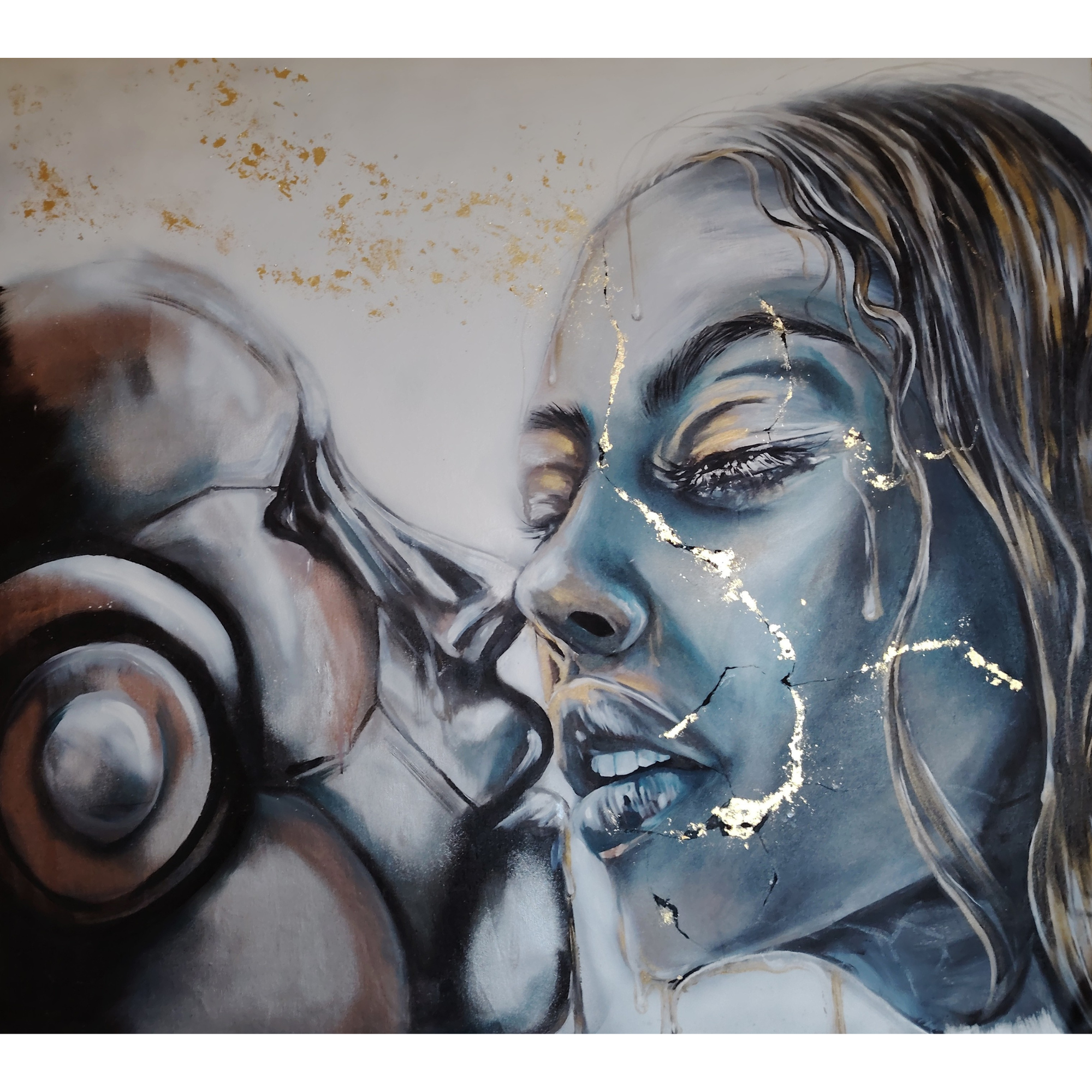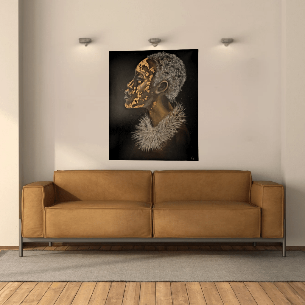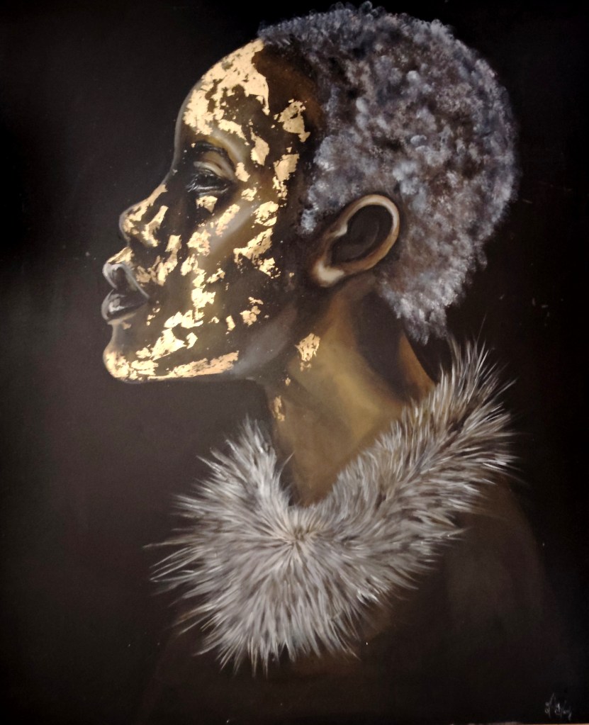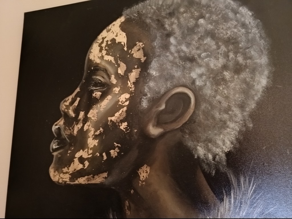 Dans toute sa féminité, la femme africaine m’a inspirée, suite à une rencontre avec ce merveilleux pays lors d’un événement. Cela m’a sensibilisé et j’ai pu en apprendre davantage sur leurs traditions. La beauté de ces femmes me touche et Gold Africa est le résultat de cette rencontre. J’ai utilisé des feuilles d’or dans des tons sombres pour faire ressortir son visage.